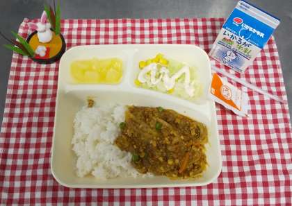 今日は、大豆入りキーマカレーライス、キャベツとコーンのサラダ、白桃(カット缶詰)、牛乳でした。キーマは、インドの言葉で「細かいもの」という意味です。挽き肉と挽割り大豆を使って栄養たっぷりに仕上げました。サラダには卵アレルギーの子も食べられるようにノンエッグドレッシングを使っています。