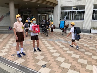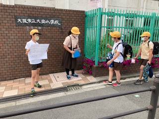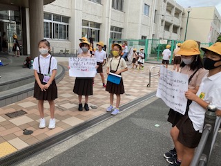 代表委員会メンバーが、先週の児童集会で呼びかけて、今朝から募金活動をしています。