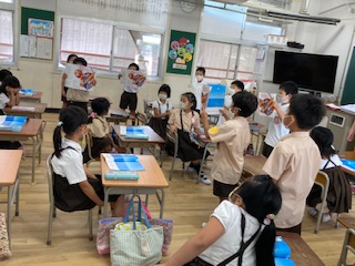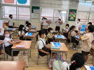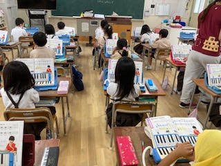 「うみ」を歌って互いに聞き合っています。鍵盤ハーモニカで、「ド」の音を確認しました。
