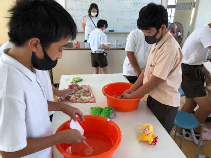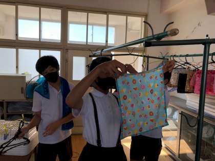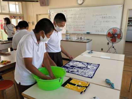 「洗濯をしてみよう」をめあてに、たらいに水を入れ、手洗いでナフキンを洗いました。つまみ洗いやもみ洗いを使い分けてすすぎもしました。最後はハンガーにシワを伸ばして干しました。