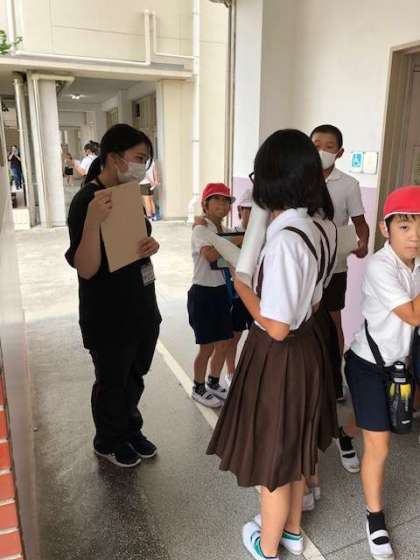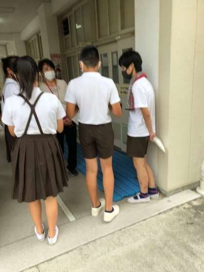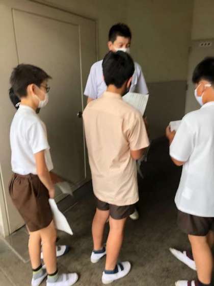 「インターネットの投稿を読み比べよう」の学習の発展として、「制服と私服あなたはどちら派?」をテーマに先生たちの経験談や考えをインタビューして回っています。