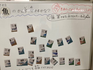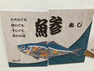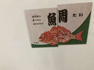 食育ルーム前に掲示してあります。2枚を組み合わせると魚の名前になります。分かるかな?
