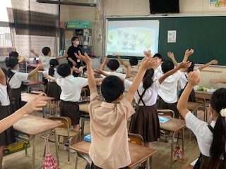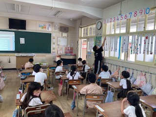 体を使ってアルファベットを唱えたり、歌ったりしています。10までの数も英語で言えています!