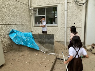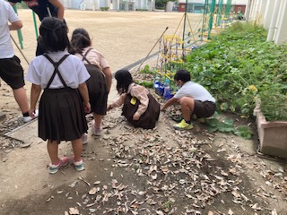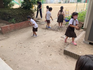枯れ葉が教室前にたくさん落ちています。掃除の時間、1年生と2年生が集めて、掘った穴に入れています。腐葉土を作ります。