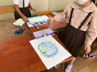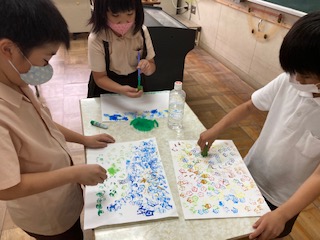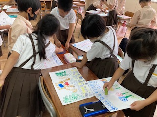 オクラのスタンプでいろいろな模様を描きました。オクラの断面は、星のようになっていてとてもきれいです。ぽんぽん押して形を作ったり、スゥーっと滑らせて模様を作ったりするなど工夫が見られます。