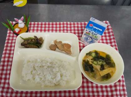 今日は鶏肉のてり焼き、みそ汁、なすのそぼろいため、ごはん、牛乳でした。今日の給食には夏から秋に旬を迎える野菜がたくさん登場しました。みそ汁にはかぼちゃやオクラ、そぼろいためには茄子とピーマンを使いました。なすとピーマンは苦手な児童が多いですが、「苦手だけど食べれた。」と言いに来てくれる子がたくさんいましたよ。旬の食べ物はおいしいだけでなく栄養もたっぷりです。