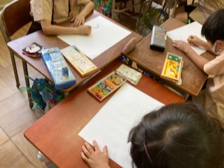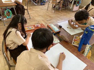 この前掘ったサツマイモの絵を描きました。大きなお芋が出てきた感動も絵に表していくのかな?