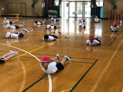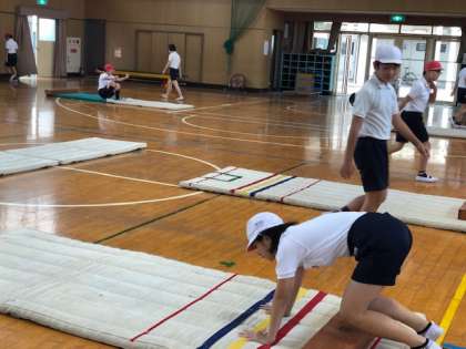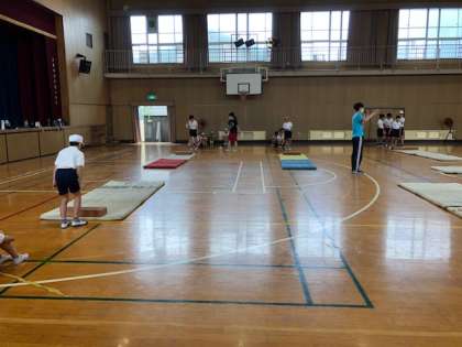 1組と3組の合同体育では、マット運動を行いました。はじめに、音楽に合わせて筋力を高める運動に取り組んでから、列ごとにマットに取りかかりました。