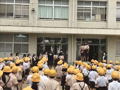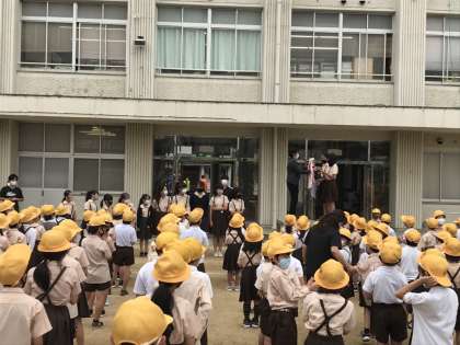 久しぶりの運動場での朝会です。校長先生からは、あいさつの仕方「語先後礼」についての話がありました。言葉と同時に礼をするのでは相手に失礼にあたる、だから言葉の後に頭を下げるというのが正しいあいさつの仕方だと教わりました。日本の文化にはその他、相手を敬うための美しい所作があること、先日の茶湯体験でも6年生が学んだことなどを話されました。