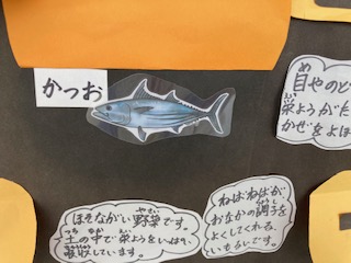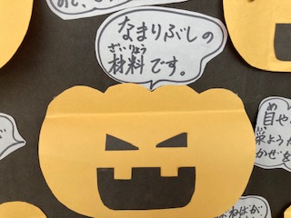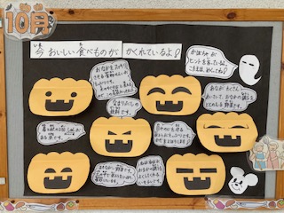 毎月、食育をテーマに栄養教諭のF先生がいろいろアイディアを出して掲示物を作ってくださっています。10月は、「今おいしい食べ物」です。カボチャをめくるとクイズの答えが出てきます。