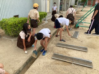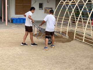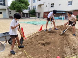 運動場の側溝の掃除をしたり、山土を低くなっているところに運んで平にしたりしました。