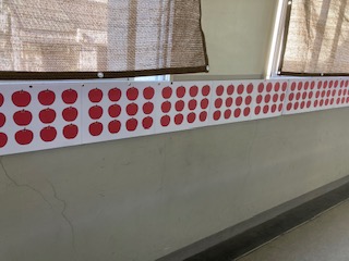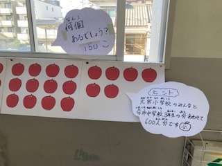 今日の給食に出たリンゴの数です。調理員さんが、全部切って芯をとってくれました。