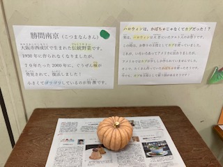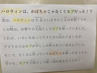 ハロウィンで今はカボチャが使われていますが、元来はカブだったそう。こつまなんきんの由来とともにハロウィンの説明も掲示してあります。