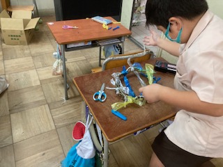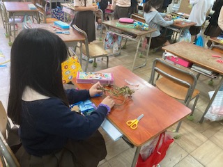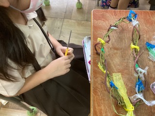 サツマイモのつるを使って、リースの形を作りました。乾燥して硬くなるまでスズランテープで巻いて、形を整えます。丸い形でなく楕円形もあって、素敵です!