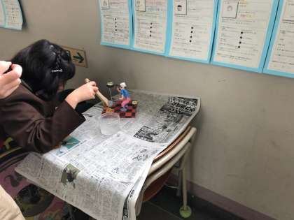 今日は仕上げの工程に入りました。ニス塗りです。背景の細かい部分や小道具を仕上げている子どももいました。作品をみていると、夢が広がりワクワクしますね。