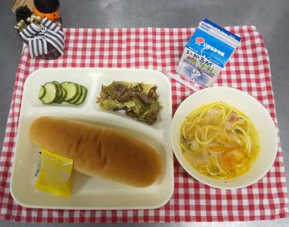 今日は牛肉のカレー風味焼き、ほたて貝とトマトのスープスパゲッティ、きゅうりのサラダ、コッペパン、アプリコットジャム、牛乳でした。ほたて貝の旨味たっぷりのスープスパゲッティは子どもたちにも人気です。みんなしっかり食べていましたよ。
