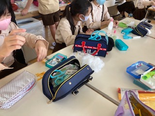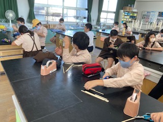 科学工作クラブでは、割り箸鉄砲を作ってていました。家庭科クラブでは、ハギレなどを利用して思い思いの小物作りに挑戦です。