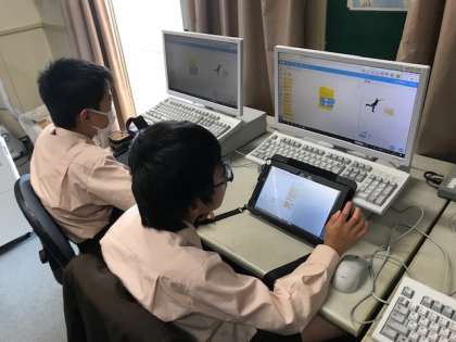プログラミングソフトを使いキャラクターや人を動かしました。また音楽室では、色々な楽器を使ってみんなで千本桜の合奏をしました。