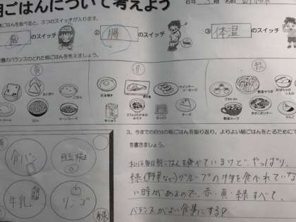 自分の朝ごはんをふりかえり、赤黄緑のバランスを意識した献立作りが大切だということを学びました。