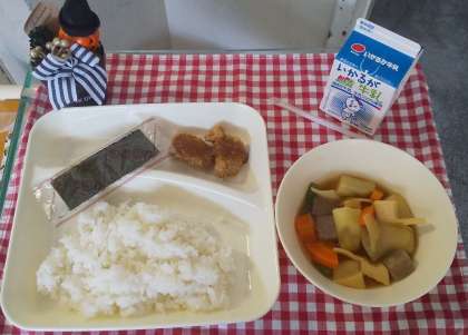 今日は、みそカツ、じゃがいもと野菜の煮もの、焼きのり、ごはん、牛乳でした。