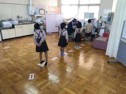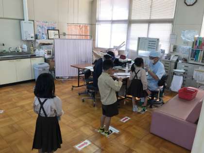 ソーシャルディスタンスをとりながら、歯科検診を行いました。虫歯にならないように、これからも丁寧に歯を磨きましょう。