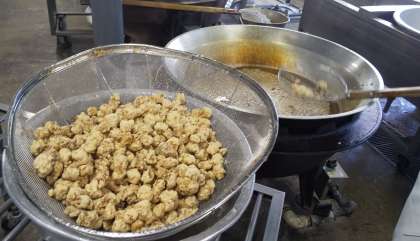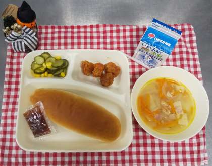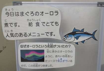 今日は、まぐろのオーロラ煮、ベーコンとじゃがいものスープ、きゅうりとコーンのゆずドレッシング、コッペパン、いちごジャム、牛乳でした。まぐろのオーロラ煮は子どもたちに人気の献立です。下味をつけ衣をつけて揚げたまぐろにケチャップ、砂糖、赤みそを合わせたオーロラソースを絡ませて作ります。1年生にも「お肉みたい」、「かたいけど美味しかった」と好評でした。