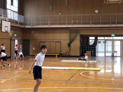マット運動の総仕上げとして、前転→後転→開脚前転→開脚後転→とび前転→伸膝後転→補助倒立を練習しました。