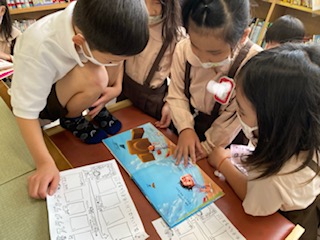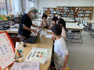 休み時間、子ども達が図書室にやってきました。来週から始まる読書週間。図書委員会児童が考えた「図書館スタンプ」は、本を一冊読むとスタンプを押してもらうことができます。たまるといつもよりたくさん本を借りることができます。図書ボランティアのKさんが、図書室を開けてスタンプを押してくださいました。大型絵本の修理もしてくださいました。