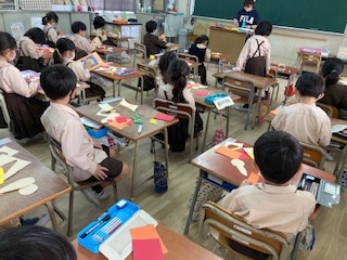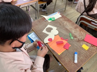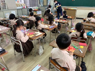 11月の玄関の掲示は、1年生。カラフルなミノムシを作っています。楽しみにしていてくださいね。