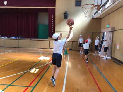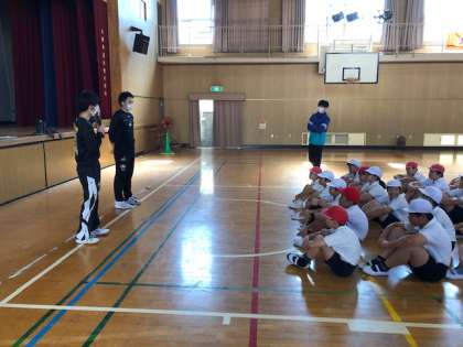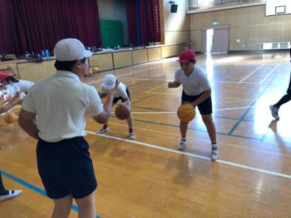 出前授業としてエヴェッサのコーチ2名が来てくださり、バスケットボールを行いました。