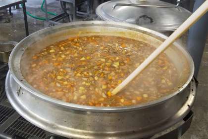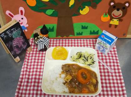 今日は、ハヤシライス、キャベツのひじきドレッシング、黄桃(缶詰)、牛乳でした。いつものハヤシライスは小麦粉で作ったブラウンルウでとろみをつけていますが、今回は米粉(上新粉)を使い、小麦アレルギーの児童も食べられるようにしました。可愛らしくくりぬいたラッキー人参も用意しました。