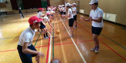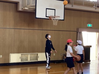 大阪エベッサの方に、バスケットボールを教えていただきました。説明するよりも実際に体を動かしながら、シュートやドリブルなどのコツを教えていただきました。現役の選手の話を聞くことで、憧れをもち、将来の夢などにも繋がったようです。