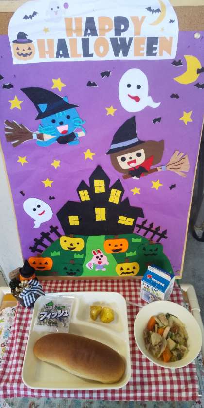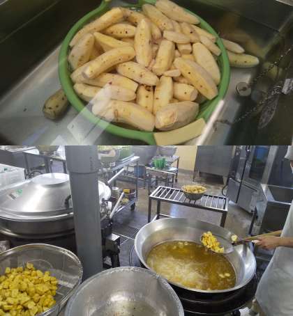 今日は豚肉といかの中華煮、大学いも、ミニフィッシュ、黒糖パン、牛乳でした。大学芋は人気の手作りデザートです。徳島県産のなると金時を一口大に切って水にさらし油で揚げ、手作りの蜜をからませました。食物繊維などが豊富なサツマイモはおやつにもおすすめです。
