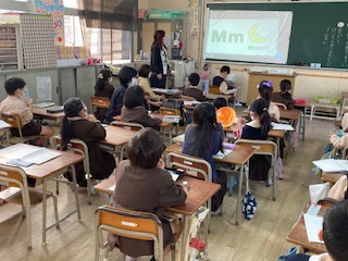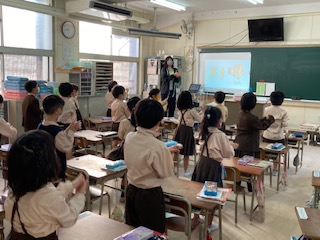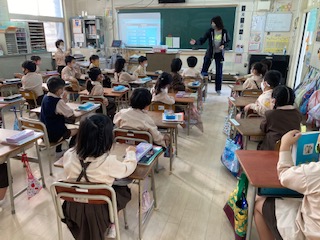 アルファベットの動画を見た後、列の端から順にABCを唱えています。全員で26文字言うことができました!