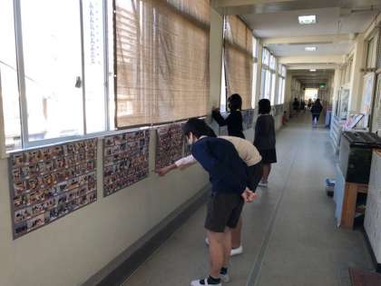 休み時間に職員室前に掲示されている修学旅行の写真を見て、購入する写真を選んでいました。