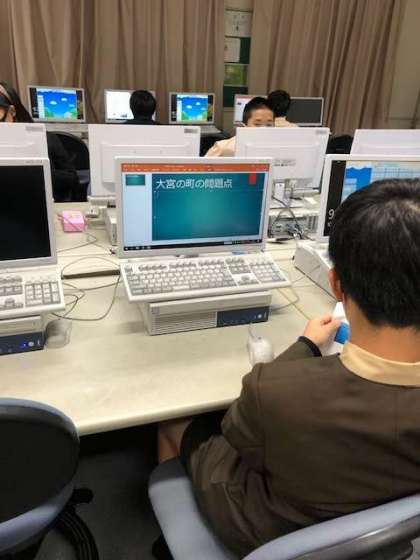 「町の幸福論」の学習に関連して、旭区や大宮のよいところ、課題、事例、提案をグループでスライドにまとめています。
