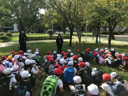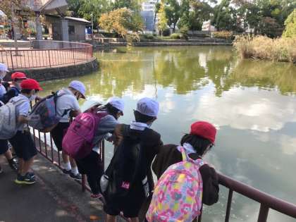 学校を出発し、城北公園に着きました。これから、秋をさがしに行きます。