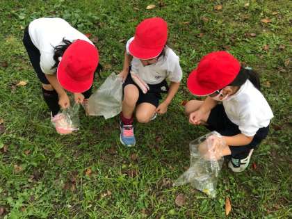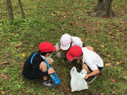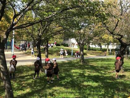 赤や黄色に色づいた葉っぱやどんぐりなど、たくさんの秋を見つけ、拾いました。