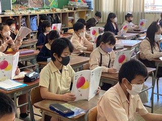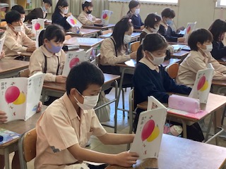 「パラリンピックが目指すもの」をみんなで音読しています。教科書の持ち方、姿勢などとても良く、マスクをしていても声がよく通ります。
