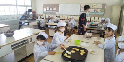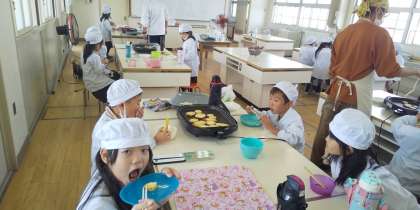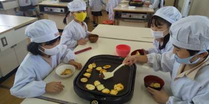お芋パーティーを開きました。学習園でたくさん収穫できた紅はるかを、前日先生達が切っておきました。子ども達は、ホットプレートでこんがり焼いて、「いただきまーす!!」にっこり、ほっこりの時間でした。