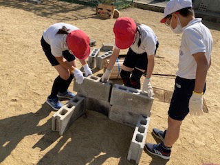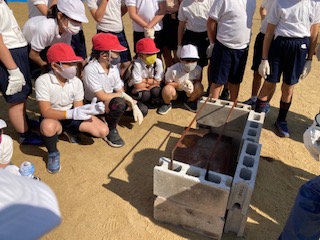 火起こしチームは、まずかまど作りからです。出来上がりの状態を見せてもらい、それぞれの班で協力しながらブロックを積んだり網を置いたりしました。