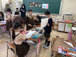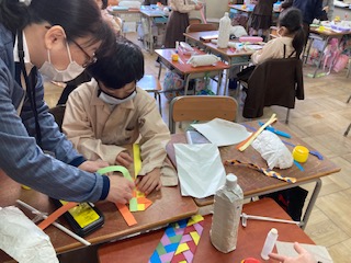 2枚の紙を折って組み合わせて模様を生み出し、冠を作っています。今日から学びサポーターのKさんが、低学年のクラスに入って支援してくださっています。