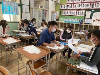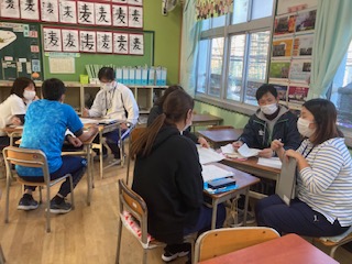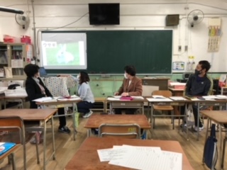 M先生を講師に迎えて研究討議会を行いました。授業を見た感想・意見などをグループで話し合い、それを全体で共有しました。クイズを使ったことで子どもたちが生き生きと活動できていた事、多様な考え方が示された事など良かった点がたくさんありました。また、自分の考えた数え方を理由をつけて書く際、評価の基準がもう少しはっきりしていても良かったのではという意見も出ました。しかし今年から入った教材を、工夫してどの子も楽しく学ばせることができたことは素晴らしいとの評価でした。