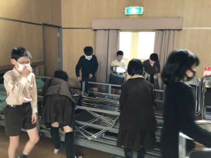 そうじ時間に6年生が講堂の椅子出しを手伝ってくれました。