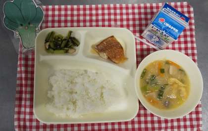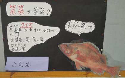 今日は、赤魚のしょうゆだれかけ、みそ汁、小松菜のいためもの、ごはん、牛乳でした。赤魚は骨や臭みが少なく、食べやすいです。写真のクイズの答えは4番です。深海魚の特徴で目が大きい魚ですよ。