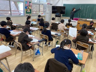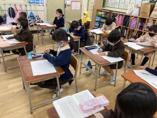 好きな教科についてスピーチをします。その発表原稿を書いています。順序に気をつけて話すために、「一つ目は」「二つ目は」という言葉を使っています。また、「なぜかというと」という言い方で、理由も述べるようにしています。
