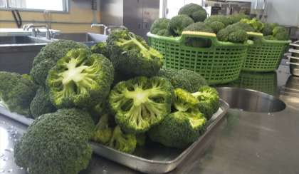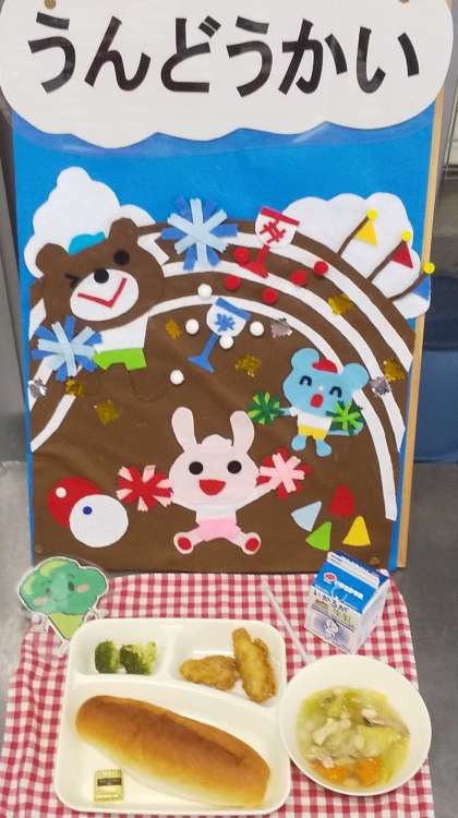 今日は、白身魚のフリッター、洋風煮、ブロッコリーのサラダ、コッペパン、バター、牛乳でした。ブロッコリーは今から旬を迎える野菜です。風邪を予防したり肌の調子を整えたりするビタミンCが豊富なので冬にぴったりの食べものです。運動会に向けて調理員さんが給食室を飾り付けてくれています。