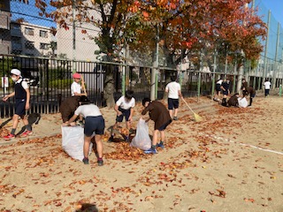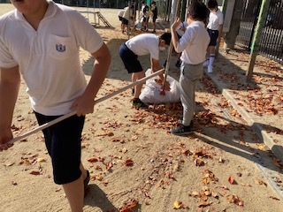 第2グラウンドの桜が美しく色づいています。でも落ち葉がいっぱいです。掃除の時間、熊手などを使って6年生が掃除をしてくれました。ありがとう!
