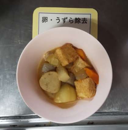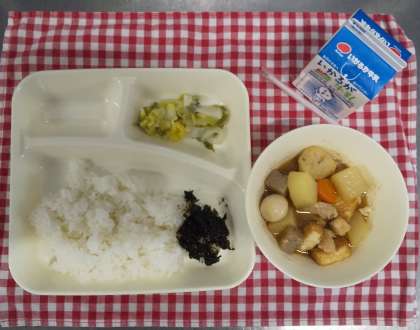 今日は、関東煮、はくさいの甘酢あえ、のりのつくだ煮、ごはん、牛乳でした。関東煮は「おでん」とも呼ばれ8種類の具材を使いました。卵アレルギーの子も食べられるように、うずら卵を除いた除去食も用意しています。手作りの佃煮は海苔の良い香りがします。おうちでも作りやすいのでレシピを見てチャレンジしてみてはいかがでしょうか?