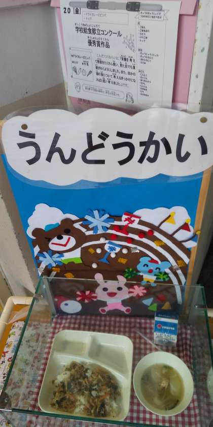 今日は、ドライカレービビンバ、トック、牛乳でした。これは昨年献立コンクールで優秀賞をもらった市内の中学一年生が考えたものです。子どもたちの好きなカレー味で野菜もたくさん食べることができる献立でした。「今日の給食おいしかった!」と好評でしたよ。